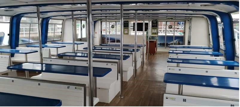 La cubierta superior, al aire libre, ofrece vistas panorámicas para que los asistentes puedan contemplar el paisaje y sentir la brisa marina. Cuenta con pasillo central que facilita la movilidad. Además, la embarcación está equipada con aseos y una barra de servicio, garantizando la comodidad durante toda la experiencia.